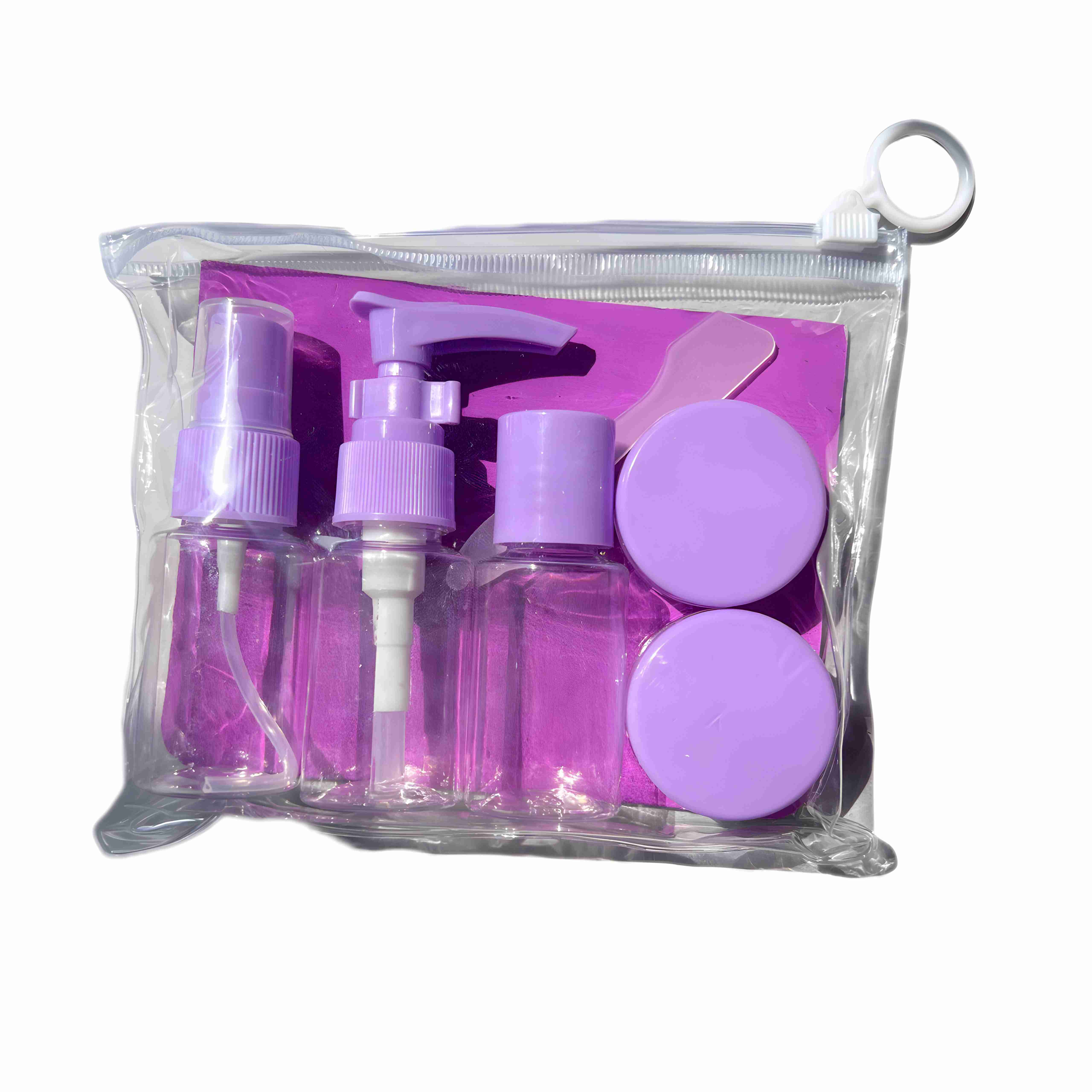 شامل یک بطری پمپی و یک بطری اسپری و یک بطری در دکمه ای و دو عدد ظرف در پیچی و کاردک می باشد و این پک از جنس پلاستیک شفاف هست و کیفیت بالای آن باعث میشود که در اثر ضربه آسیبی به محصول نرسد این پک را میتوانید در استخر و یا کنار ساحل نیز استفاده کنید به دلیل درب محکمی که بطری ها و ظرف های پیچی دارد به هیچ عنوان مواد از داخل به بیرون نمیریزد و هیچ شن و یا گرد وخاکی درون محصول وارد نمیشود.