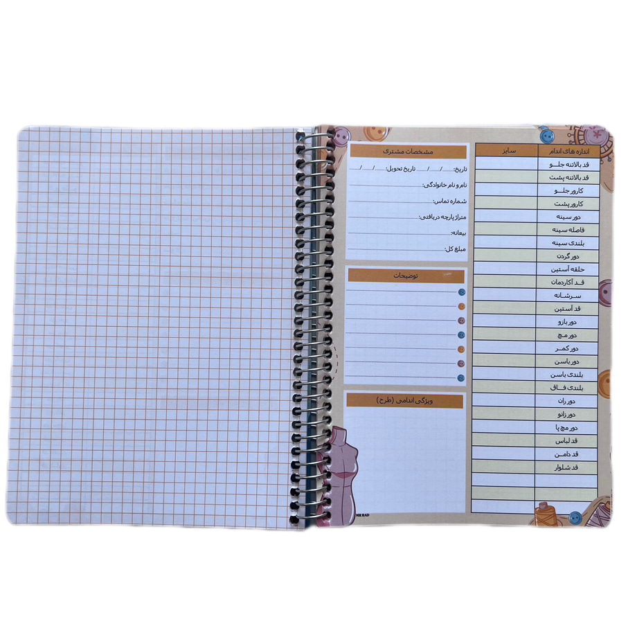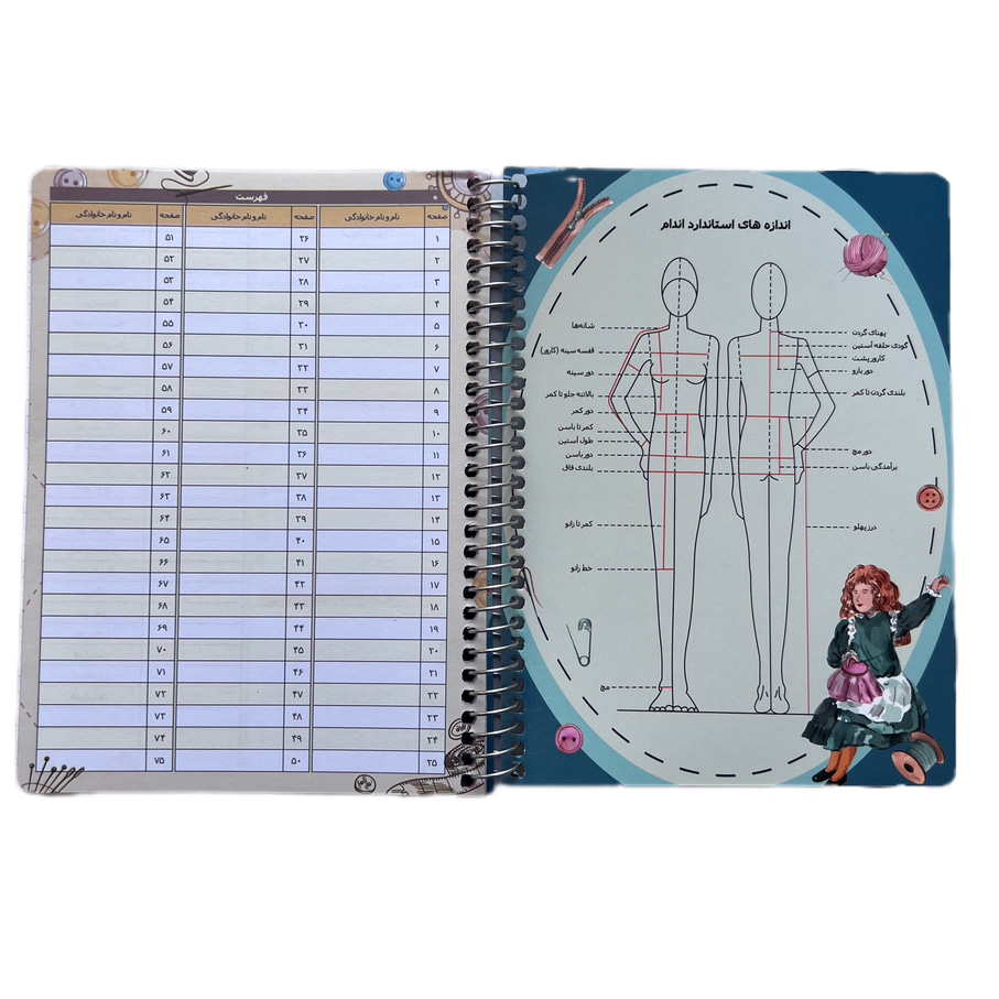 این دفتر برای ثبت اندازه لباس بانوانطراحی شده است . خیاطان عزیز میتوانند با ثبت این اندازه ها در دفتری با طراحی منحصر به فرد ، اندازه مشتریان خود ، مبلغی که دریافت کرده اند، متراژ پارچه دریافتی و موارد دیگر به کارخود نظم ببخشند. همچنین در صفحه مقابل ثبت اندازه ها یک صفحه شطرنجی قرار داده شده است که هنرمندان طراح لباس میتوانند مدل لباس مورد نظر مشتری خود را بر روی آن طراحی کنند .