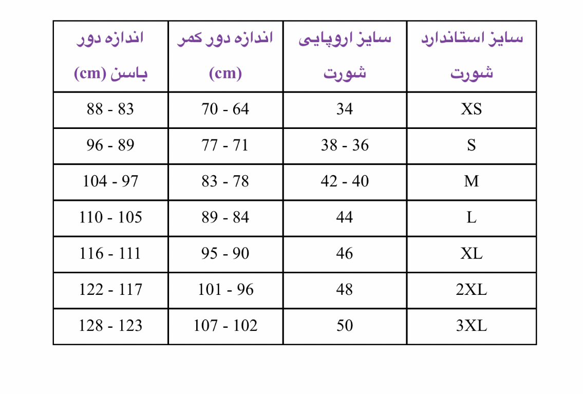 همانطور که در جدول سایز بندی شورت زنانه بالا مشاهده میکنید، سایز شورتهای زنانه با استفاده از مقادیر عددی یا با حروف اختصار انگلیسی نشان داده میشود. بنابراین، افراد باید بهجای تکیه بر برچسبهای سایزبندی شورتها به اندازهگیری قسمتهای مختلف بدن توجه کنند.